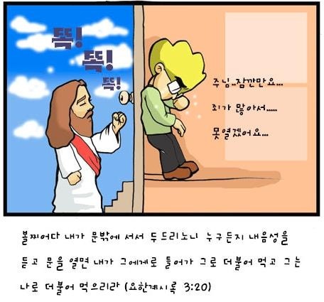 “볼지어다 내가 문 밖에 서서 두드리노니 누구든지 내 음성을 듣고 문을 열면 내가 그에게로 들어가 그와 더불어 먹고 그는 나와 더불어 먹으리라”(계3:20)
